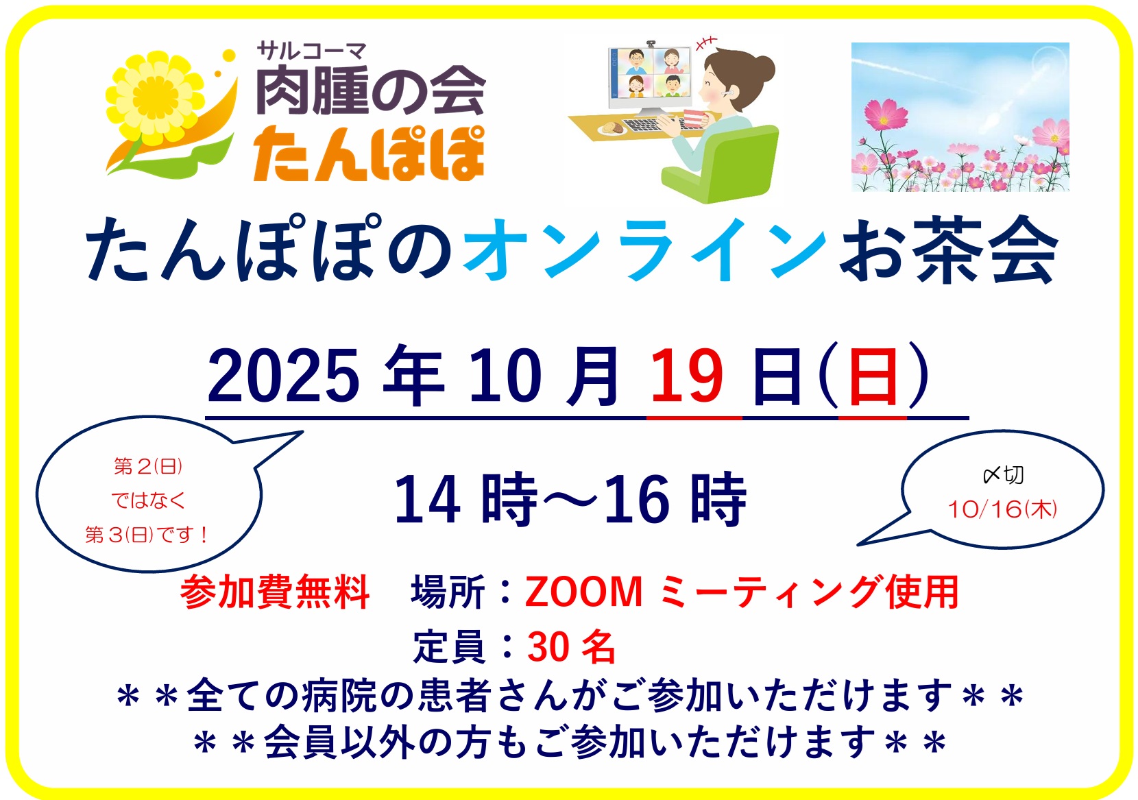 10月のたんぽぽのお茶会は、「第3日曜日」のオンライン開催となります。また仲間の皆さんで色々とお話しませんか?